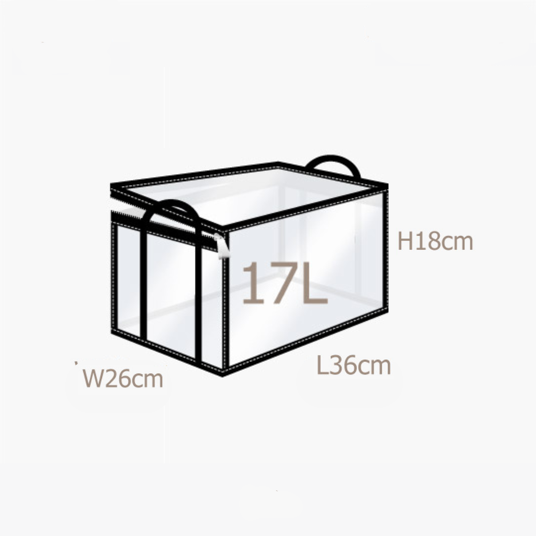 尺寸合適,放書數量剛剛好,而且透明看得見內裡,堅固耐用兩側手挽,方便提起。17L:36L x 26W x 18H (cm)