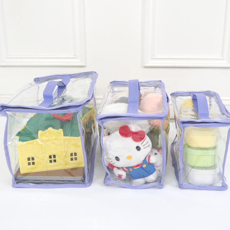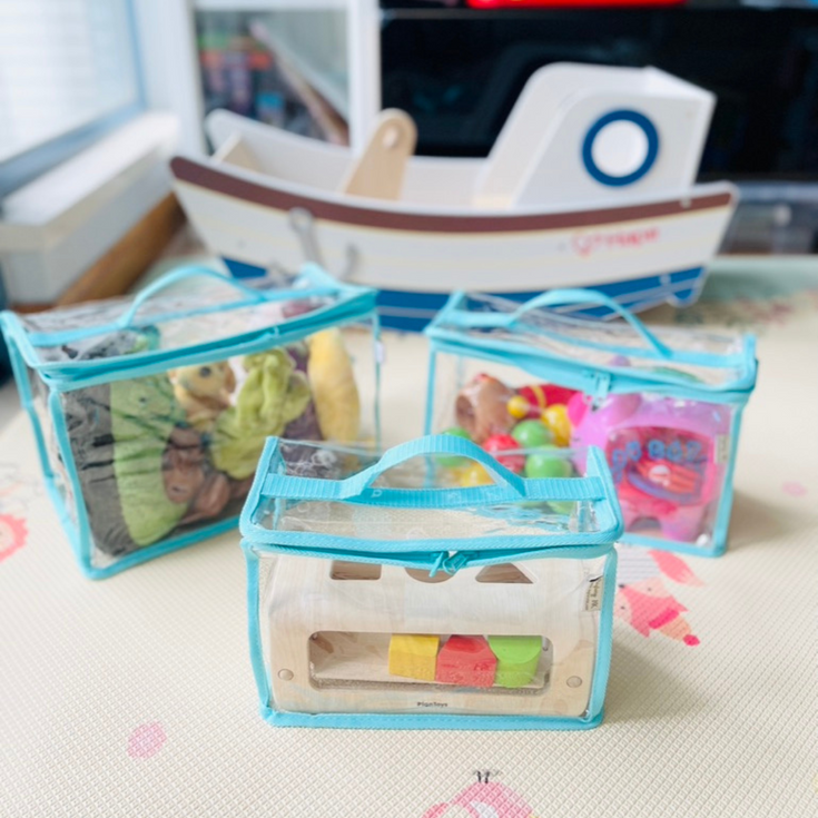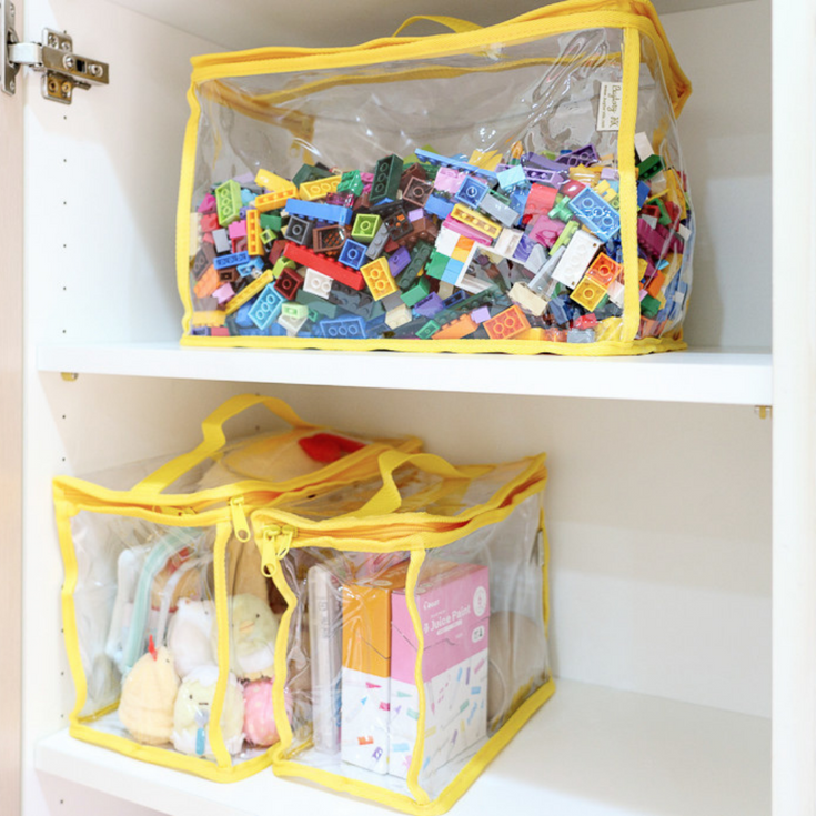 收納習慣必須從小養成,並要教導孩子玩完後要把玩具放回原位,因此收納用品不能過大或過重,讓他們能夠自己拿取及收拾。熱賣的百寶混款寶具袋,備有3款尺寸,可擺放不同大小的玩具,透明設計更有助孩子把玩具分類、方便尋找與歸位;單帶式提把讓孩子輕鬆提著;拉鍊袋口不怕孩子打翻玩具,避免散落在家中各處。