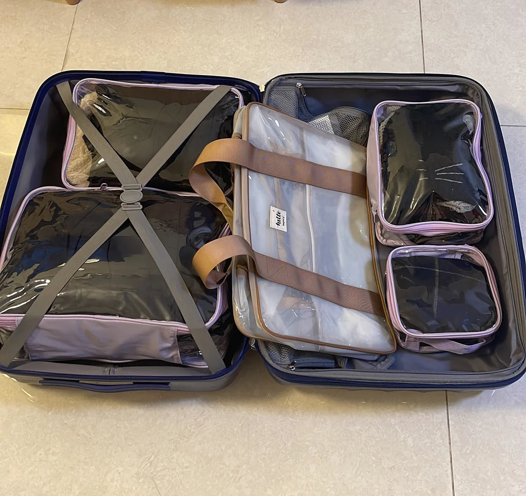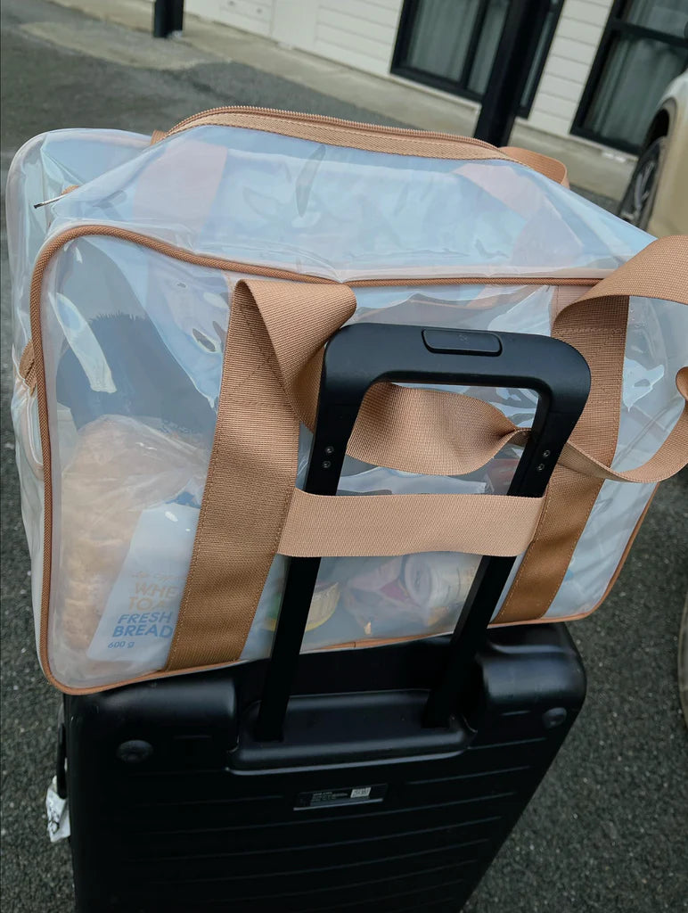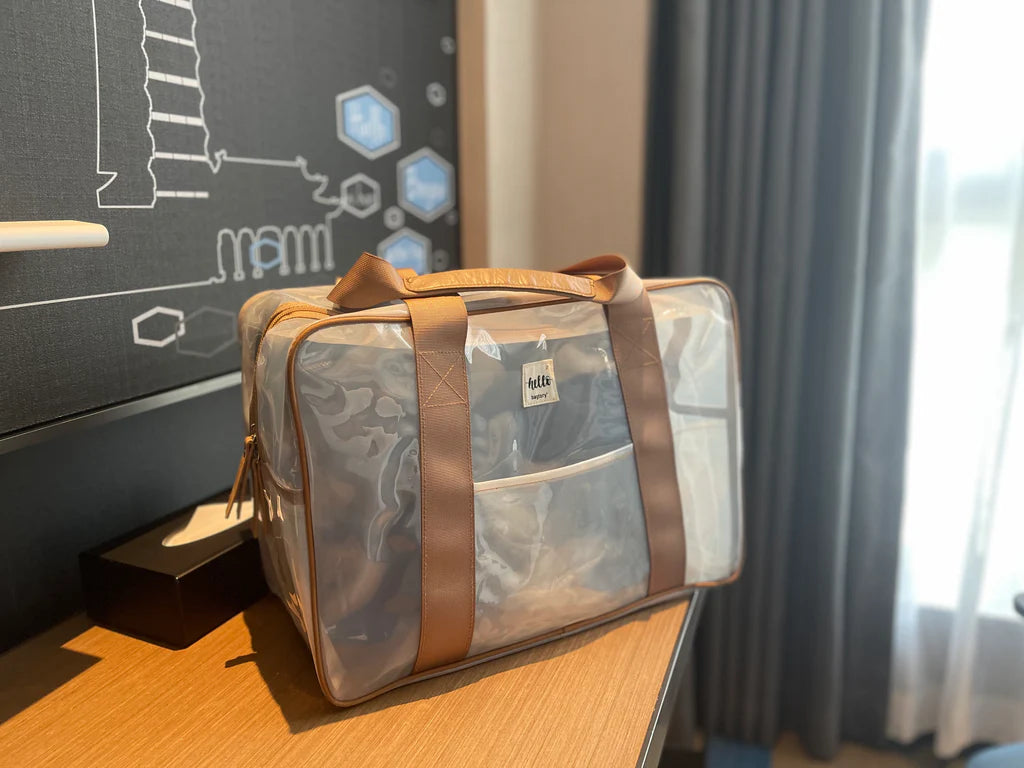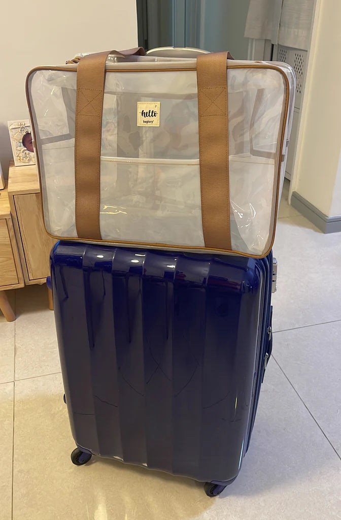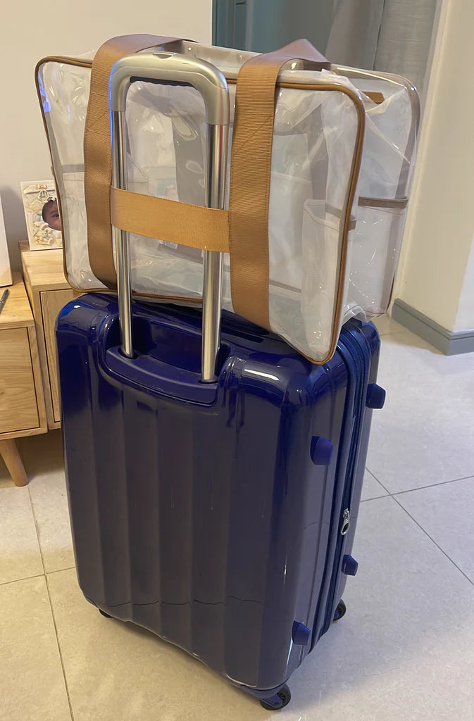 採用有色透明環保PVC製造,高質感超大容量。面料帶有朦朧美的感覺,平添了一股神秘感。無論居家收納、宿營、旅行、大型購物等都適合。可套於拉桿袋上使用。