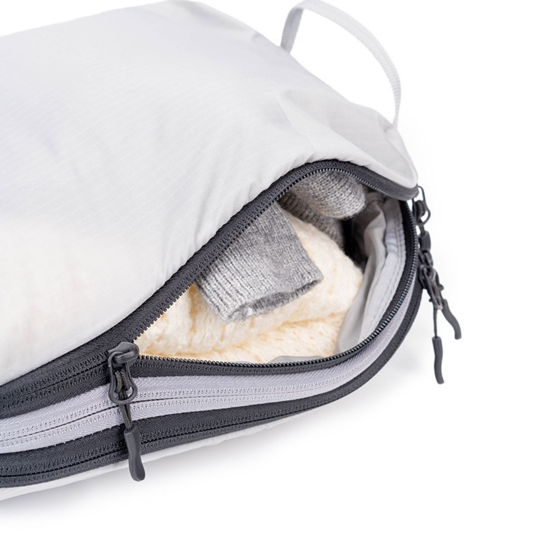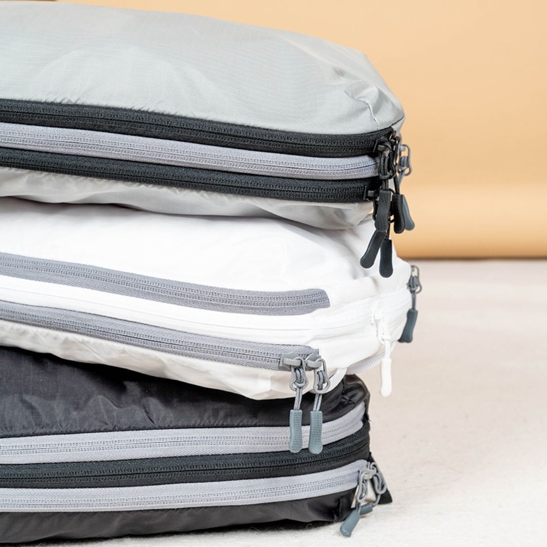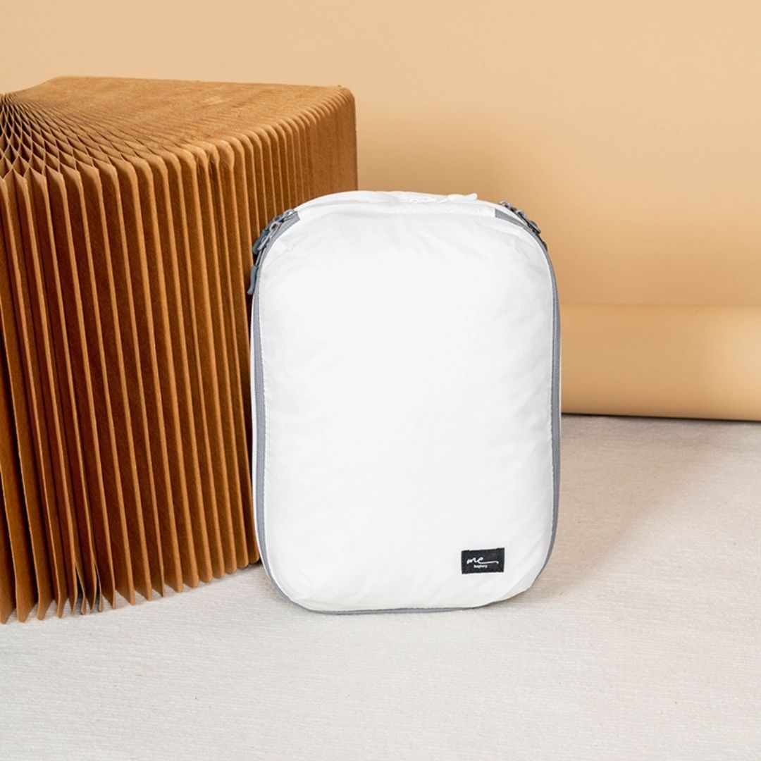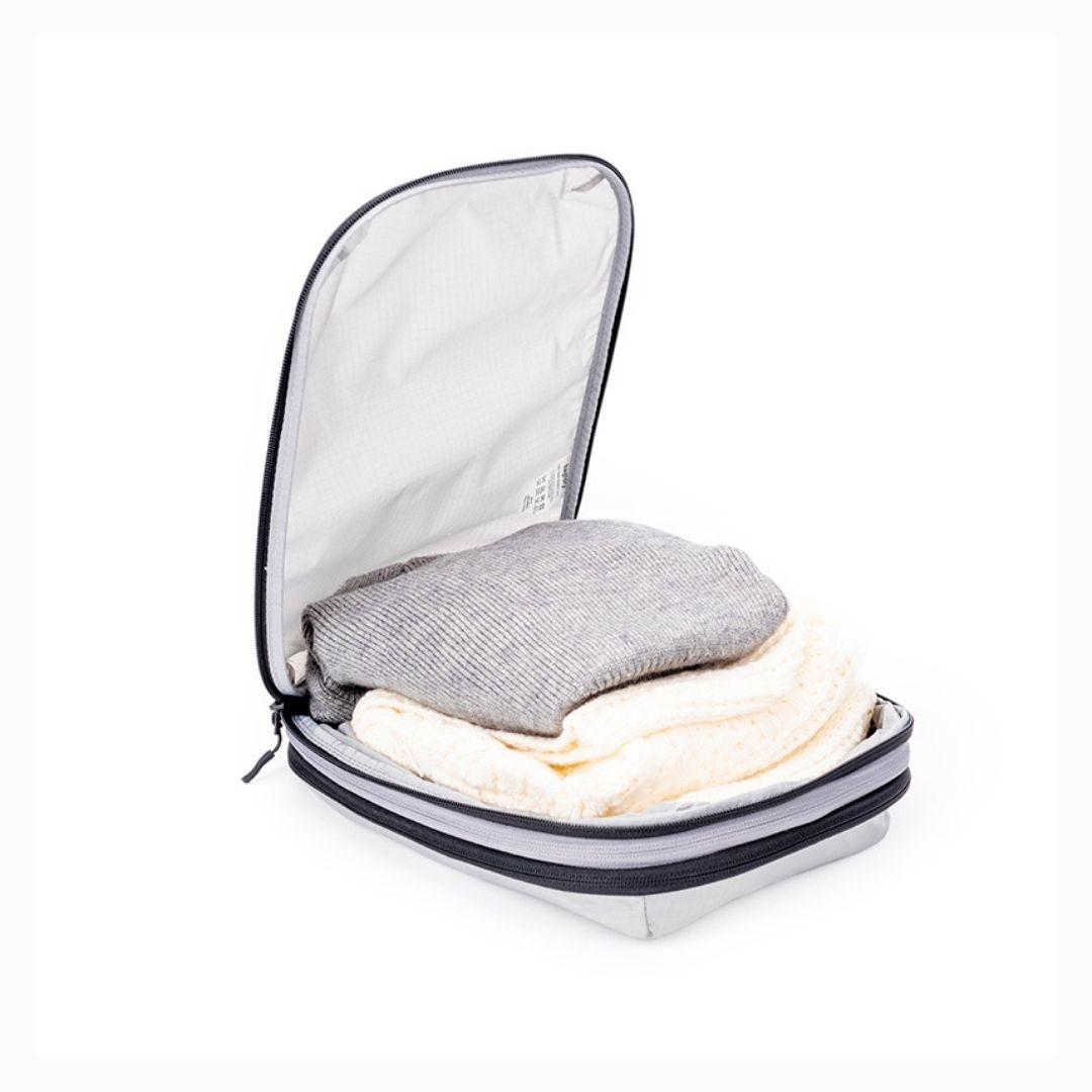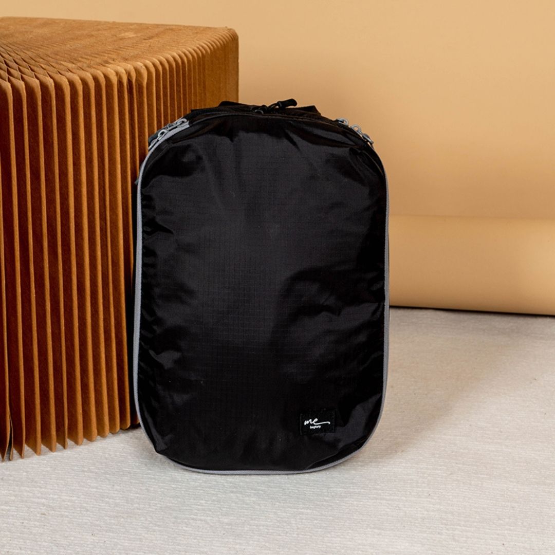 採用高彈性防潑水暗格紋尼龍料製造,高品質且超輕量。利用中間隱藏式壓縮拉鍊將收納包側圍高度壓縮,便於將體積縮小至少一半。無論去旅行、健身、做瑜伽也適合。備有單格及雙格設計,滿足您不同收納需要。它特別適合配合背包使用,直放式設計配合手提帶,方便拿出使用。
