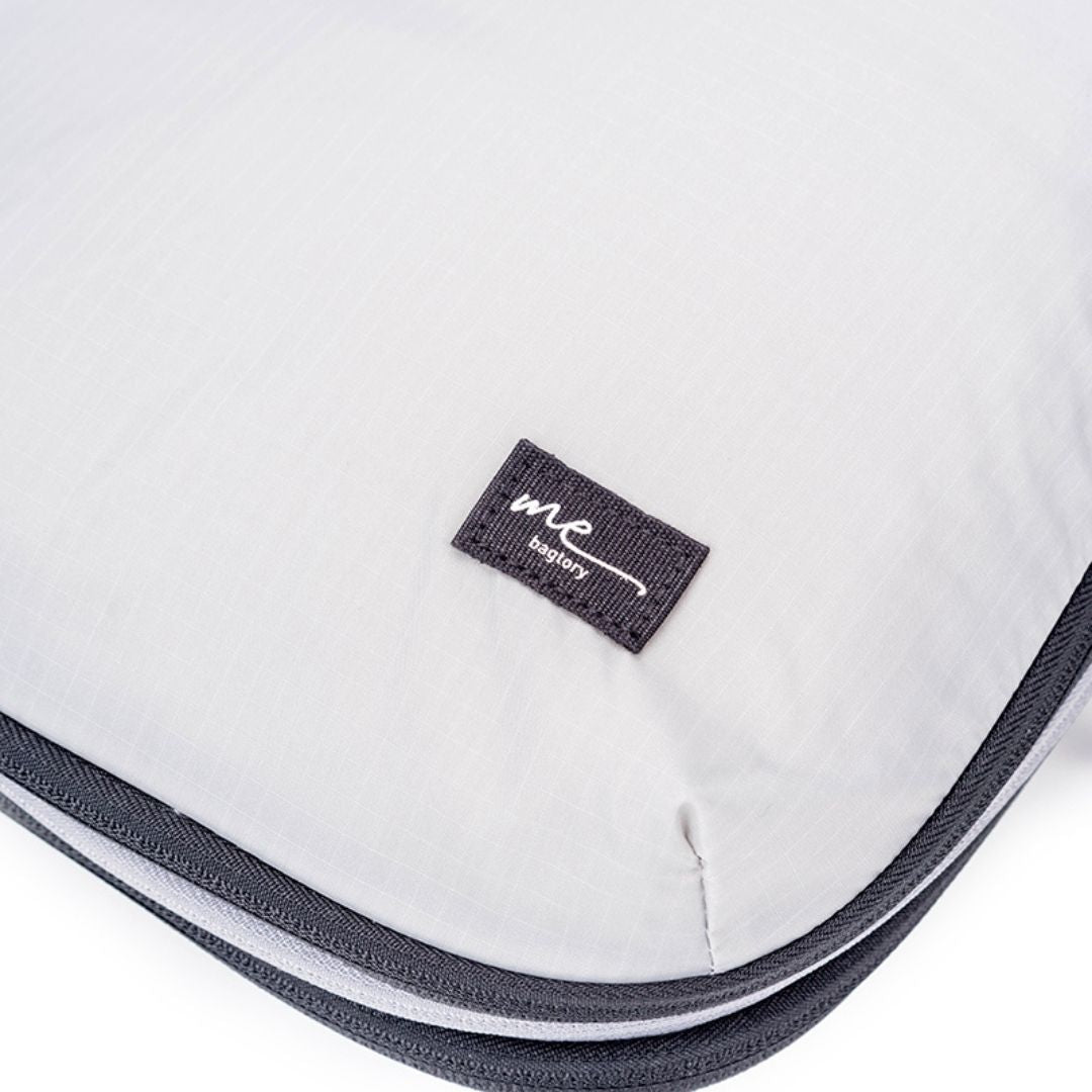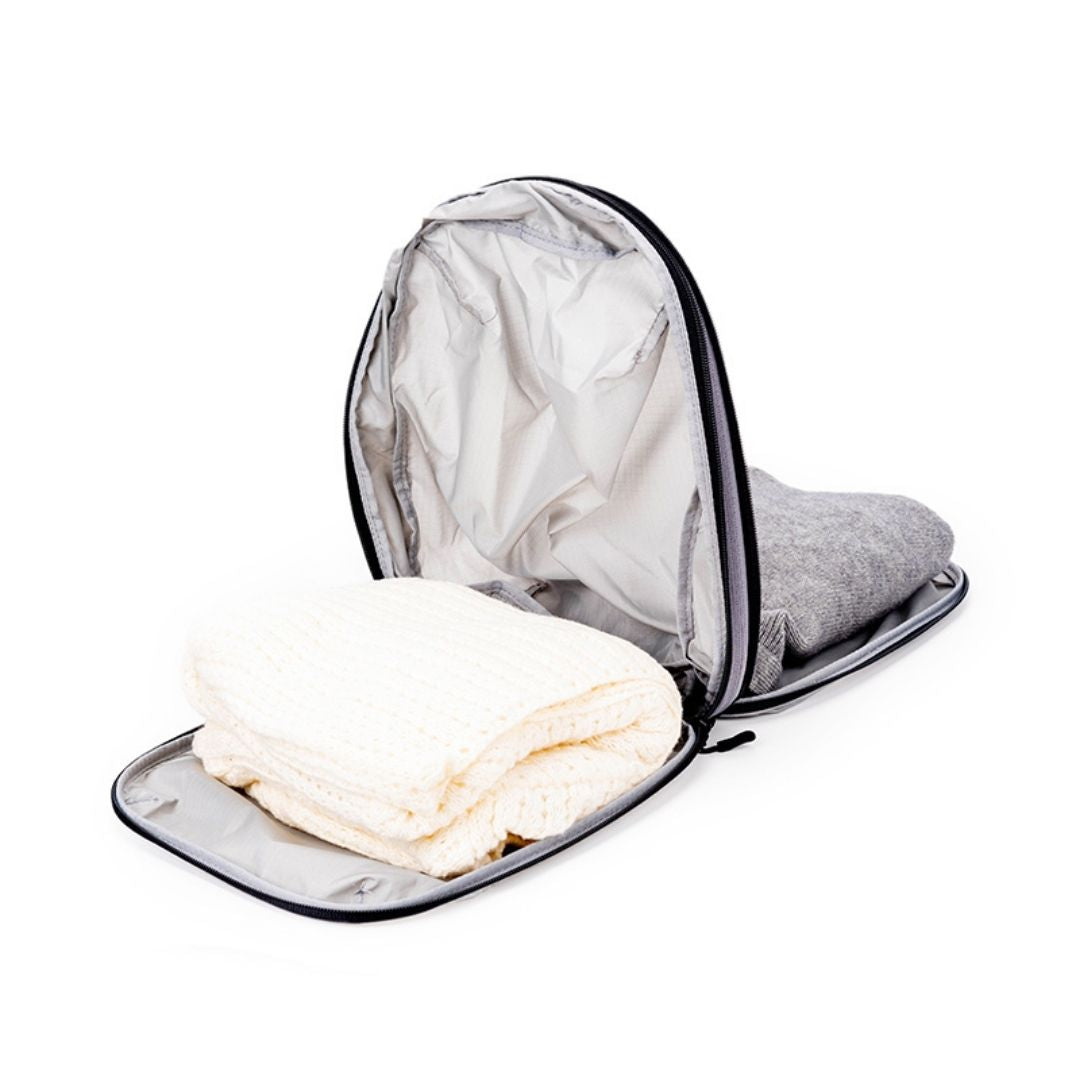 - 中間隱藏式壓縮拉鍊,將側圍高度壓縮,便於將體積縮小至少一半